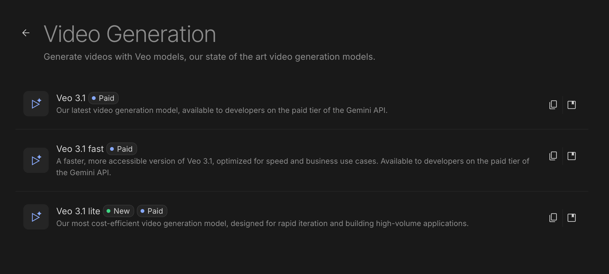 在本文更新時 (2026.04.11),Google AI Studio 提供的影片模型為 Veo 3.1,均為付費模型。Veo 系列模型是 Google 推出的影片生成模型,能模擬多種電影感鏡頭,同時維持畫面的連貫性與節奏感,讓影片呈現更自然的敘事效果。