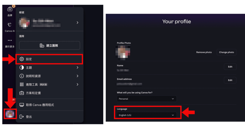 2.在 Canva 畫面中點選左下角頭像進入「設定」,將 Canva 的預設語言設定為英文 English(US)。