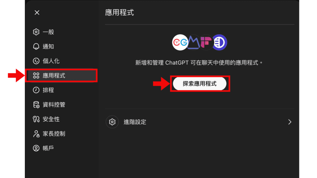 3.接著回到 ChatGPT 環境,在 ChatGPT 的「設定」中,左方選單列選擇「應用程式」,進入「探索應用程式」。