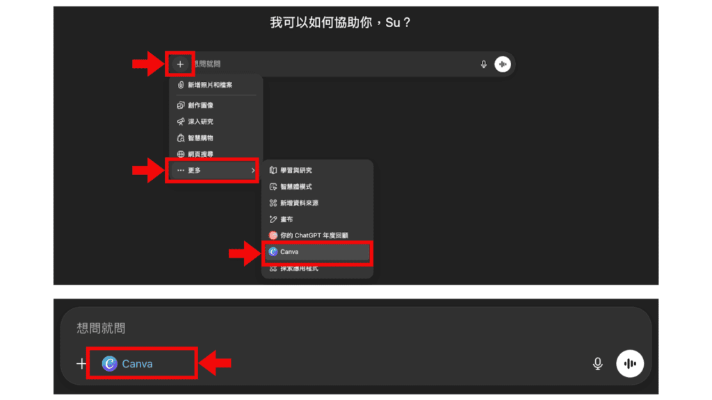 完成串接 Canva 應用程式的設定後,就可以在 ChatGPT 開啟一個新的對話,只要點選指令對話框旁邊的「+」按鈕,選擇「更多」,就可以切換到 Canva 模式。