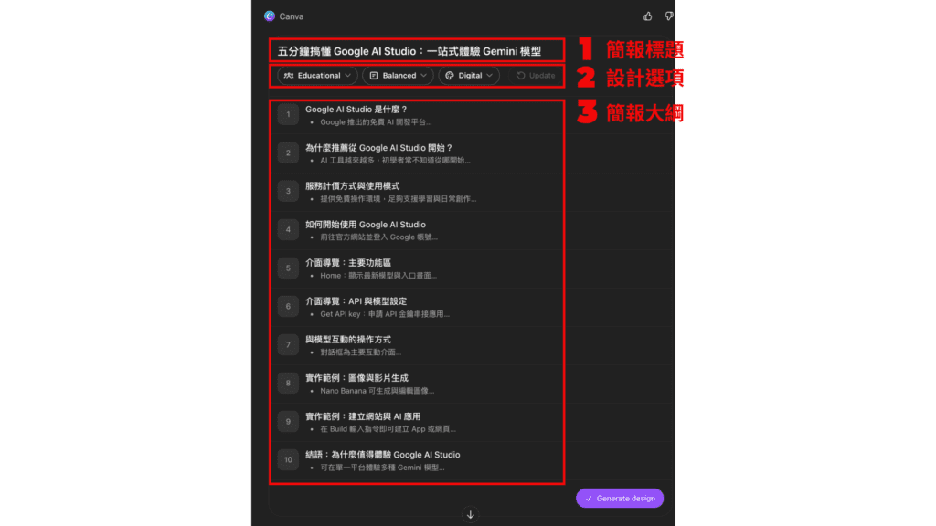 • 輸出語言:簡報的語言,支援多國語言,可生成繁體中文