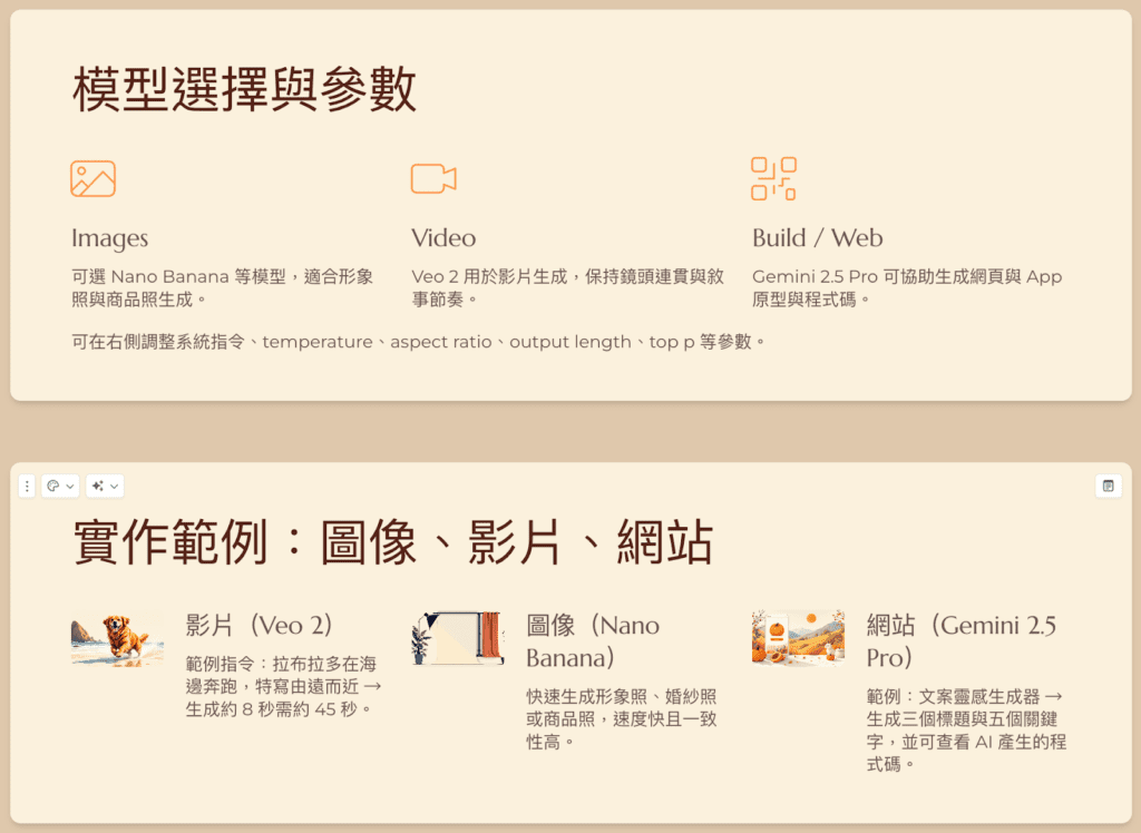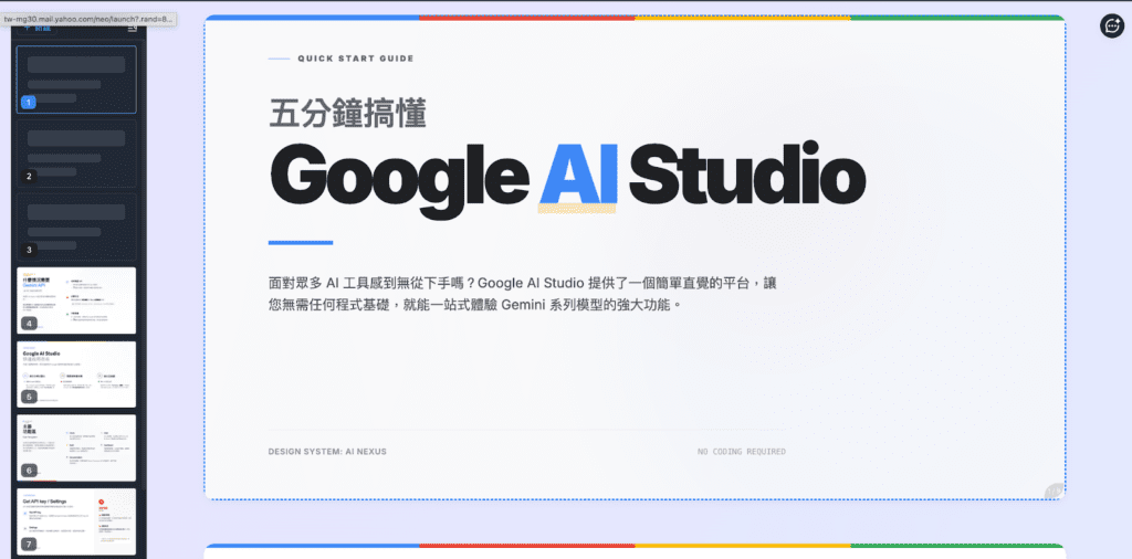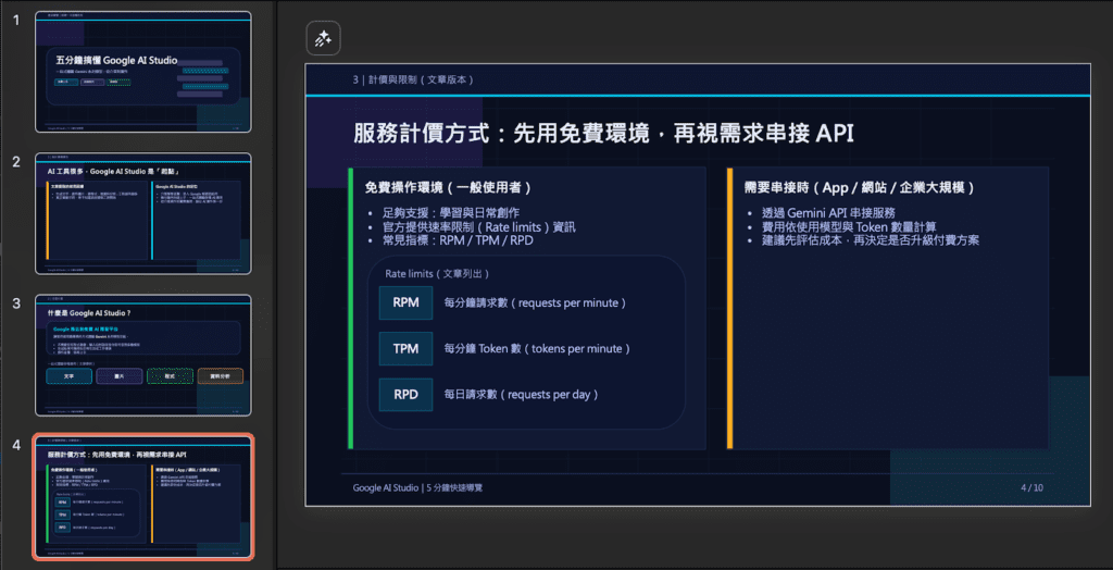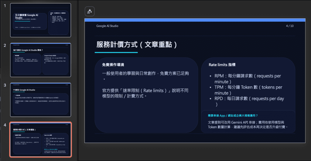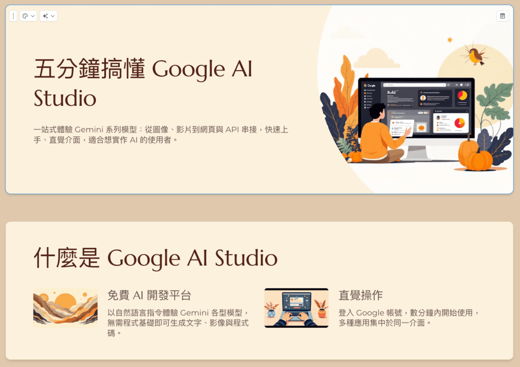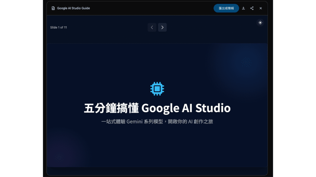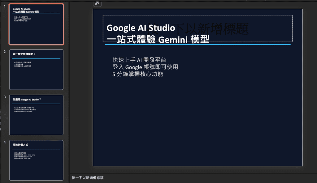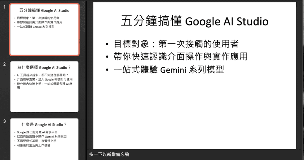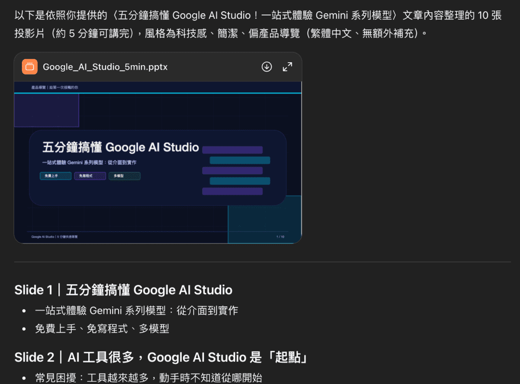 本次實測選擇的文案內容素材將使用團隊的部落格文章〈 五分鐘搞懂 Google AI Studio!一站式體驗 Gemini 系列模型 〉作為文本內容參考,將這篇文章的內容分別交給 ChatGPT、Gemini、Gamma 與 Felo 來製作簡報,觀察這些工具如何將原本以文字為主的內容轉為簡報形式。