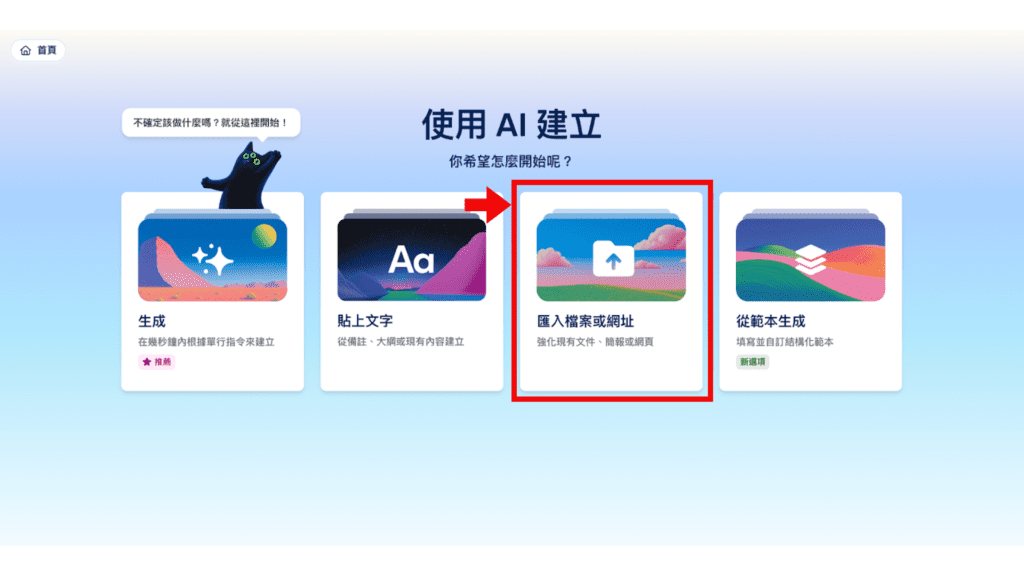第一次登入的時候系統會詢問你的組織人數、使用偏好等,接著可以選擇要如何開始,例如:生成、貼上文字、匯入現有的檔案等。