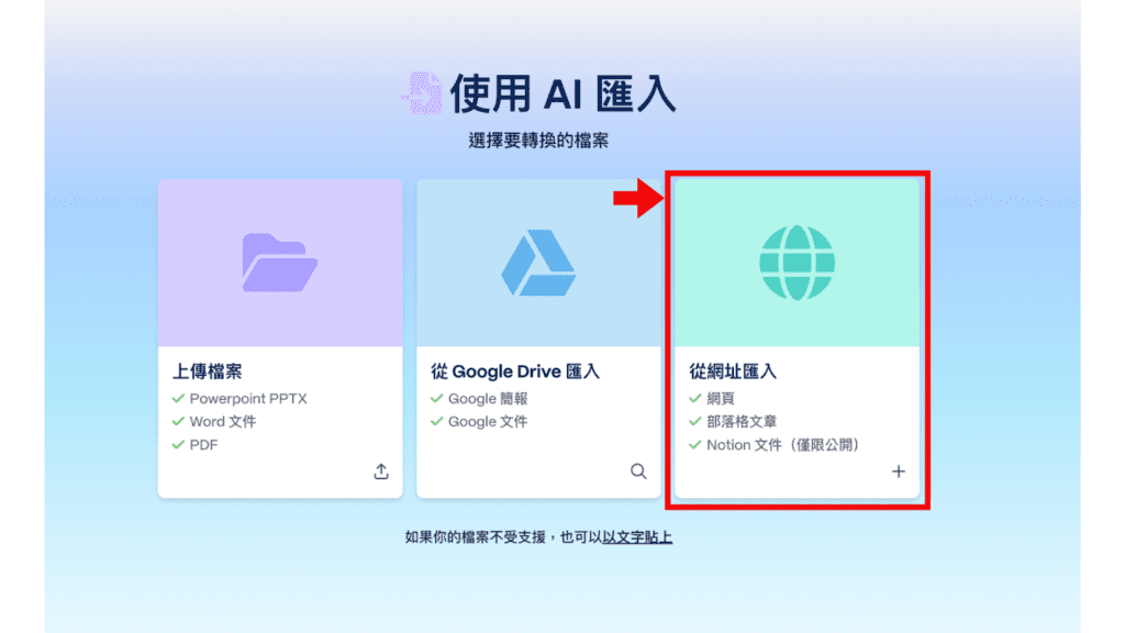 補充:實務上若您的資料為非公開內容,也可以透過「貼上文字」的方式,直接貼上純文字內容作為 Gamma 簡報生成的資料來源。