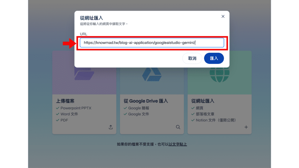 本次實作以「匯入檔案或網址」的方式,將部落格文章〈五分鐘搞懂 Google AI Studio!一站式體驗 Gemini 系列模型〉網址作為文本內容,讓 Gamma 直接透過部落格文章內容來生成簡報。進入「匯入檔案或網址」後選擇「從網址匯入」並貼上文章網址。