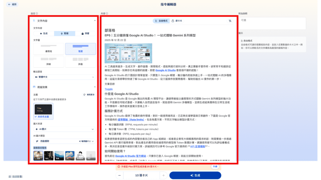接著會進入「指令編輯器」頁面,可以在這裡明確指定 Gamma AI 生成簡報的方式,包括: