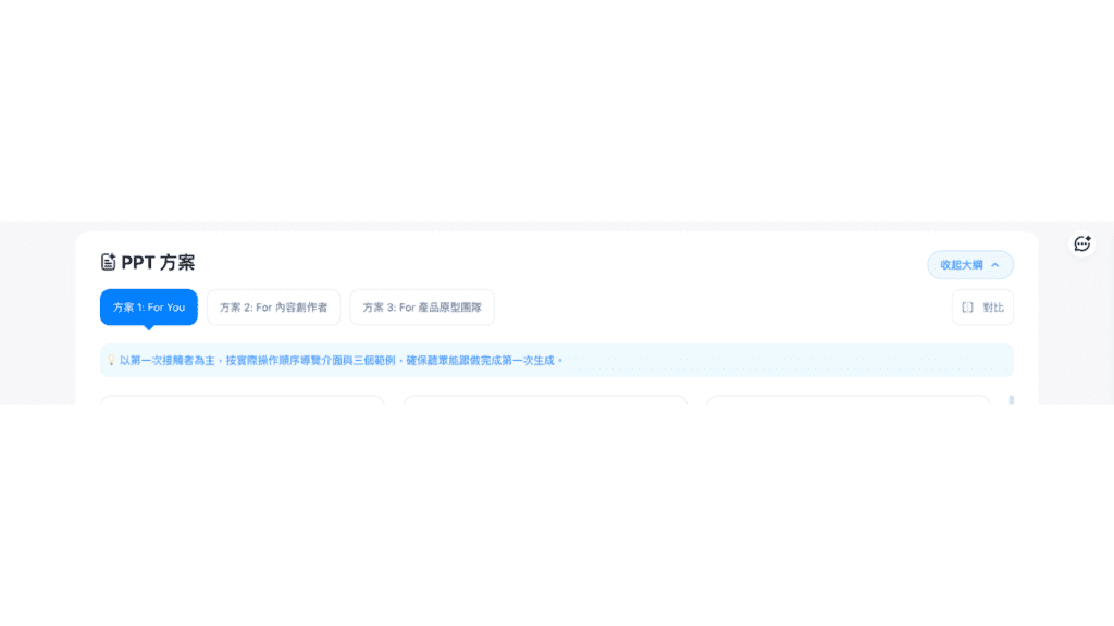Felo 不會直接生成簡報,而是會先根據不同「故事線」設計不同方案,例如:針對內容創作者、產品團隊等不同受眾,選擇方案後,Felo 才會逐張生成投影片。