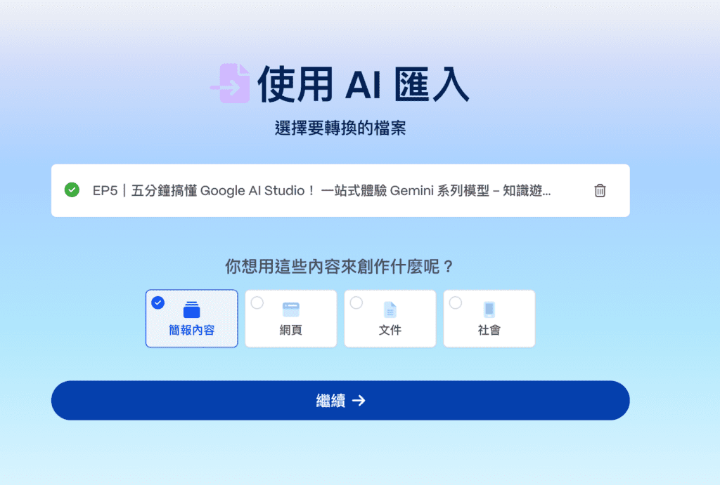 成功匯入後,可以接著選擇想要用此內容來進行什麼創作,維持預設選擇的「簡報內容」,接著按下「繼續」。