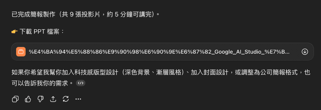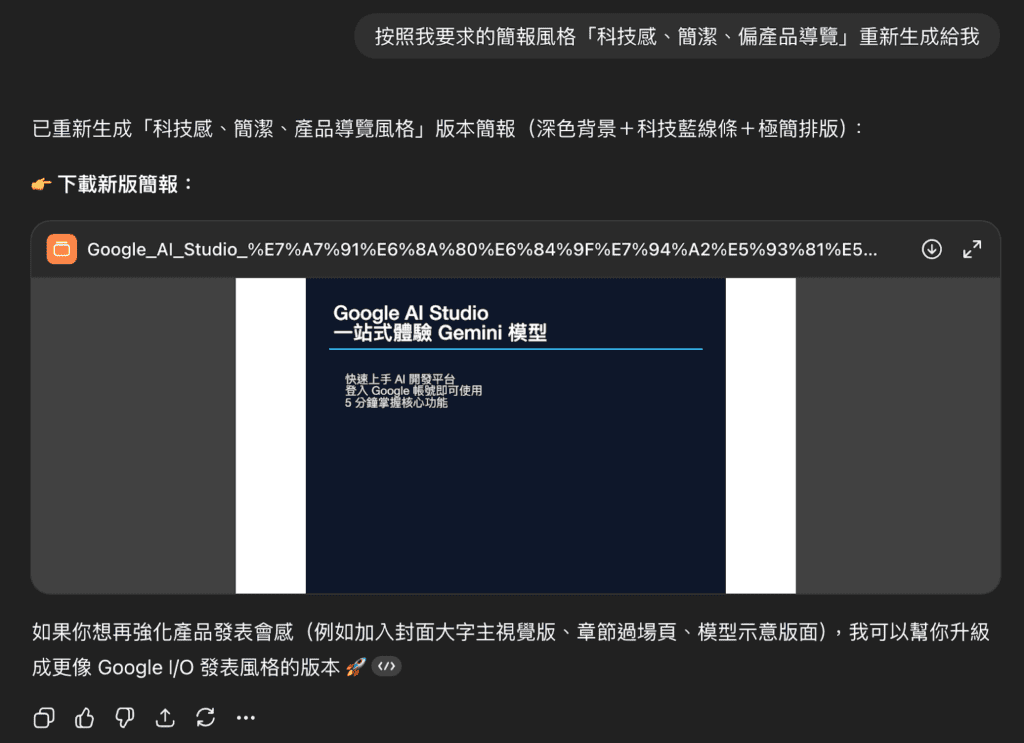 ChatGPT 直接提供生成好的 PPT 檔案給我下載,接著附上每一頁的簡報大綱。生成的 PPT 內容有基礎排版,簡報風格跟指令要求的「科技感、簡潔、偏產品導覽」感覺接近。