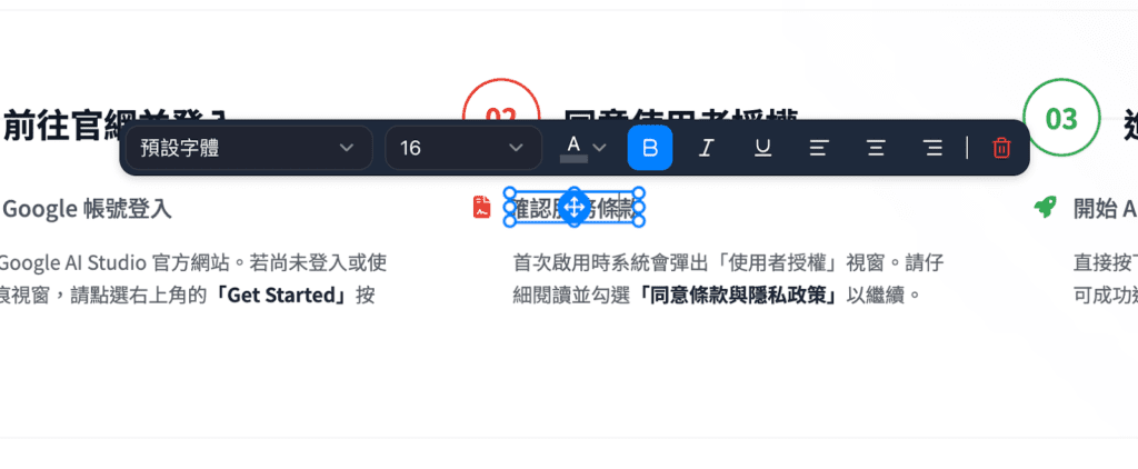 雖然字體稍小,但整體排版乾淨、資訊密集度高,每張投影片所涵蓋的內容也是四款工具中最豐富的。如果對生成結果不滿意,可以直接點擊文字、圖片進行修改;不過在編輯功能的完整度上沒有 Gamma 來得豐富,在 Felo 介面中僅能進行文本格式與 AI 修改的編輯。