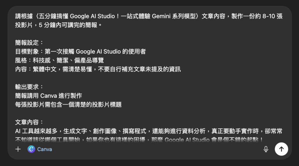 Google 在 2025 年 3 月推出了 Gemini Canvas 功能,官方表示 Gemini Canvas 能夠將想法轉化為應用程式、遊戲、資訊圖表等多元內容,在本次實測中我們將使用 Canvas 功能來嘗試製作簡報。