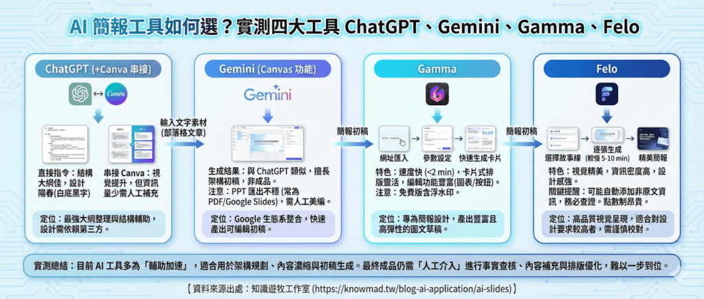 接下來這篇文章將實際示範「如何透過 AI 製作簡報」,分別以大家熟悉的 ChatGPT、Gemini ,以及近來相當受到關注的 AI 簡報工具 Gamma 與 Felo 為例,實際比較它們在「內容整理、結構編排與設計呈現上」的差異,幫助你判斷在不同情境下,哪些工具真的派得上用場,感興趣的話就繼續看下去吧!