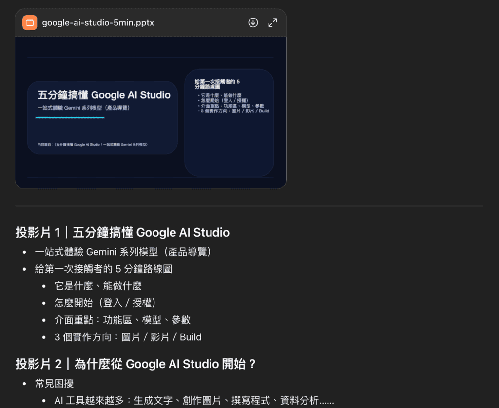 我以指令追問「請匯出 powerpoint 檔案給我下載」,但是 Gemini 只有提供簡報大綱給我,讓我自行貼在 powerpoint 製作簡報(苦笑)
