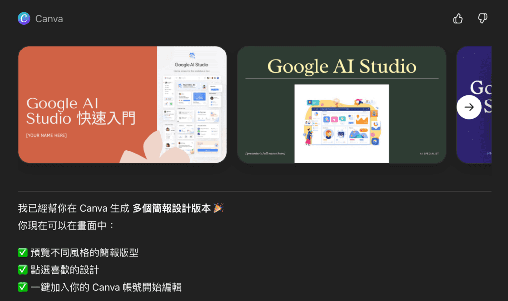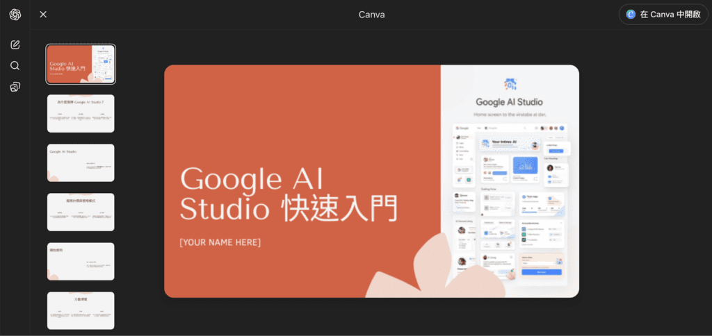 提醒:四種版本在 ChatGPT 界面中進行瀏覽,要進一步點選右上角的「在 Canva 中開啟」,才會在串接好的 Canva 中生成簡報喔!
