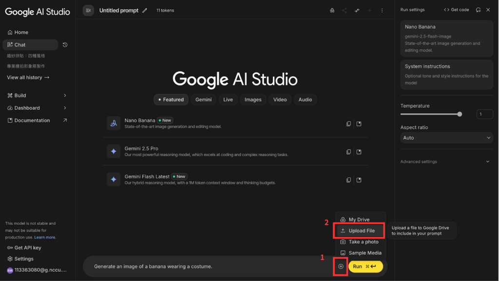 - 這樣就成功進入 Nano Banana 圖片生成的模式了。在畫面底部的對話視窗可以上傳圖片或輸入自然語言指令(Prompt)生成圖像。我把方法一生成的圖片上傳之後,輸入以下指令