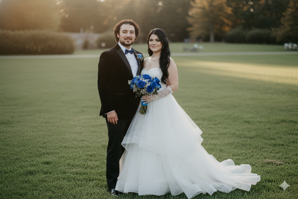 ・女性主角:身穿長款無肩帶白色婚紗禮服,裙擺蓬鬆並帶有薄紗層次,搭配白色手套與珍珠飾品,黑色長髮呈現柔和波浪造型,手中拿著一束藍色玫瑰