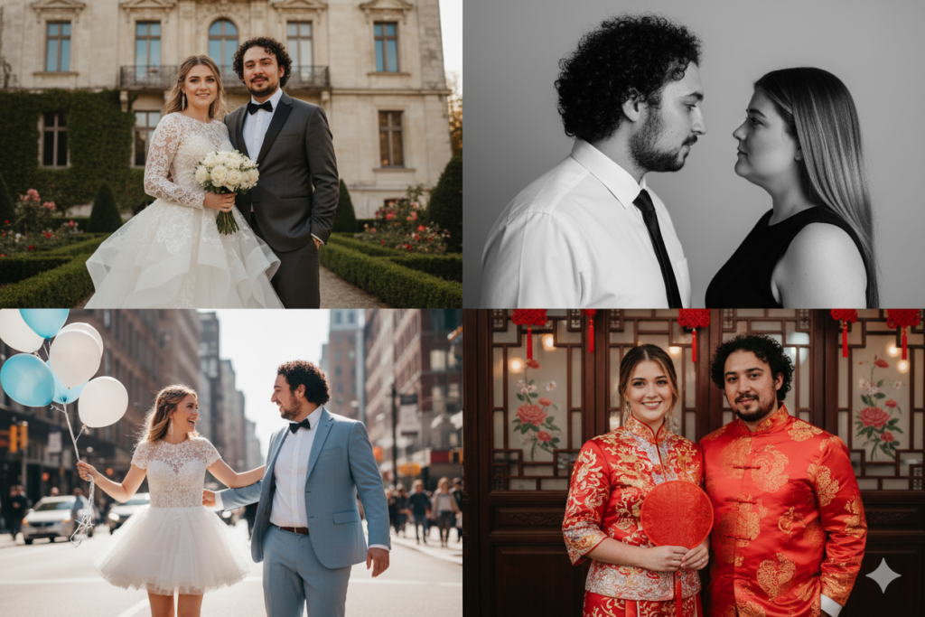 為了進一步測試 Nano Banana 的視覺一致性,這次嘗試讓 AI 生成一組由四張照片構成的婚紗拼貼組。