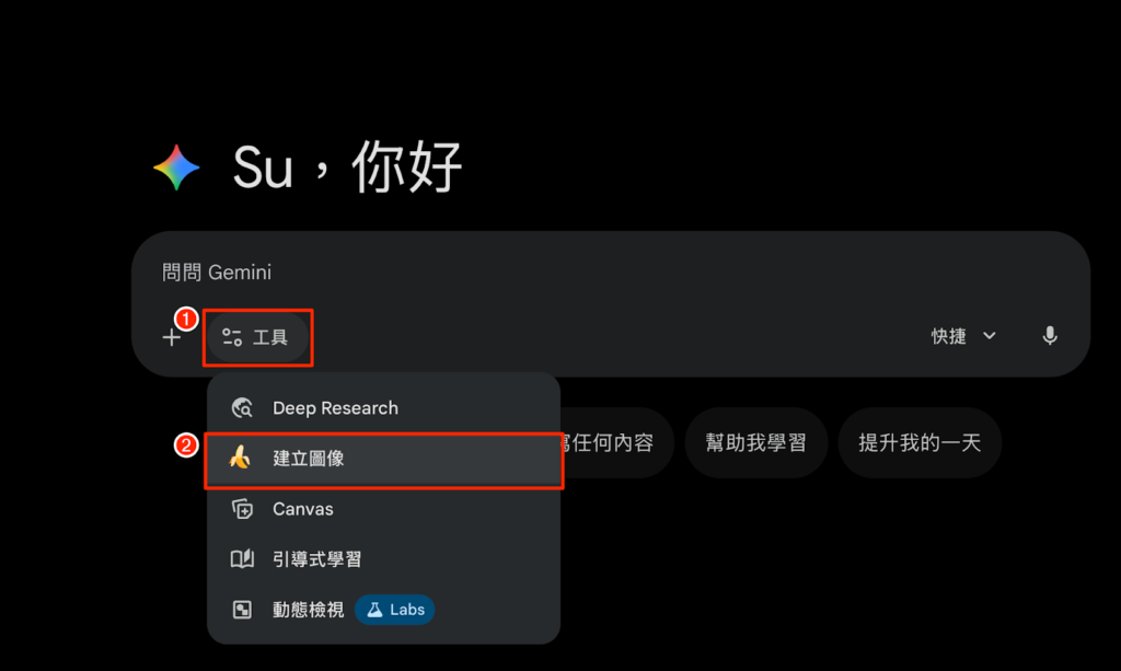 - 開啟 Gemini,在對話視窗中,點擊「工具」,選擇「建立圖像」,進入圖像功能