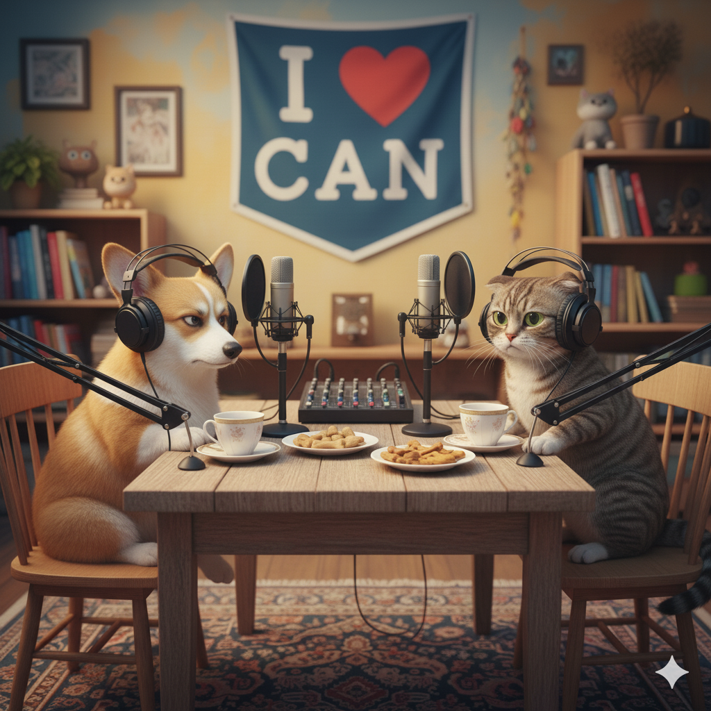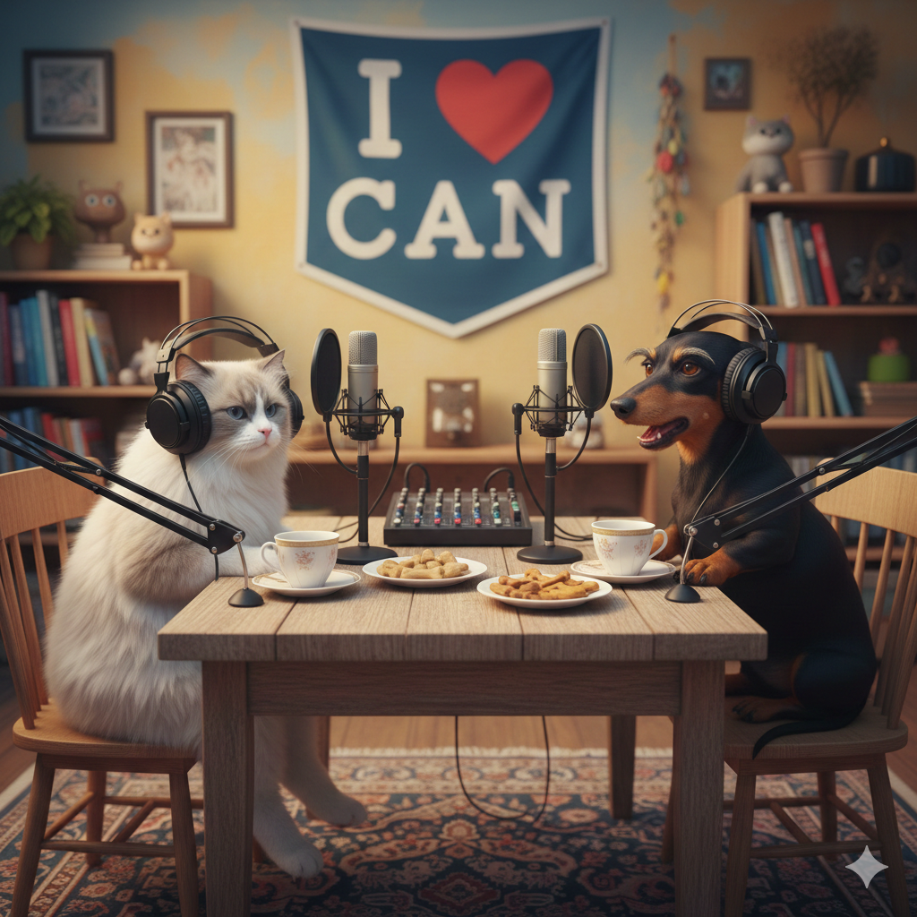 一隻貓咪跟一隻狗狗在錄製 podcast 討論貓狗跟人之間的禮節,貓咪狗狗都要戴著專業的耳機,對著錄製 podcast 的設備器材講話,環境是一起坐在一張木製桌子,背景溫馨色彩,牆上掛著布條寫著「I love CAN」,貓咪是布偶貓,狗狗是四目黑臘腸狗