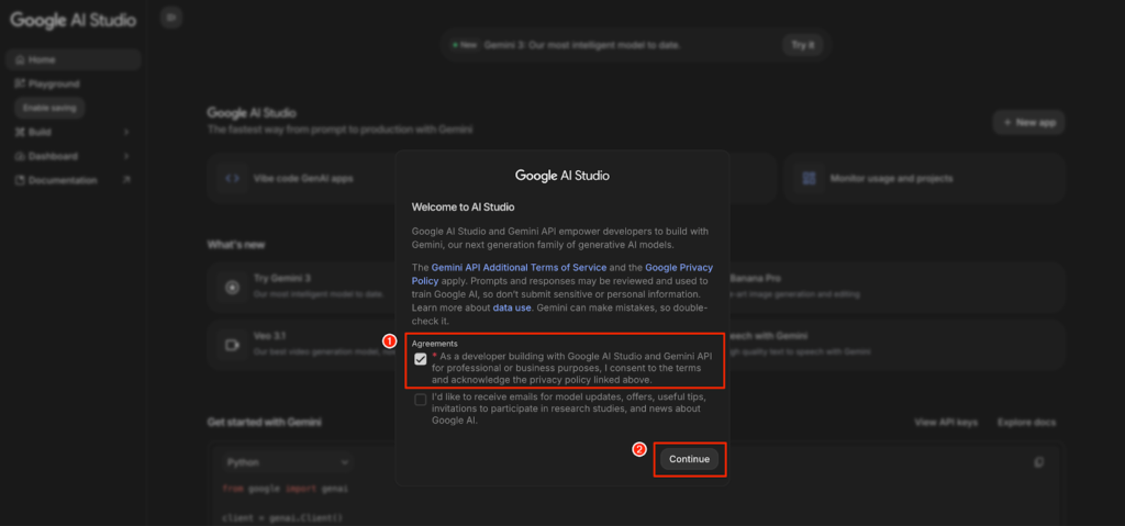 如果你是第一次開啟 Google AI Studio 的話,在進入網站時,畫面會出現一個「使用者授權」視窗,如下圖所示。