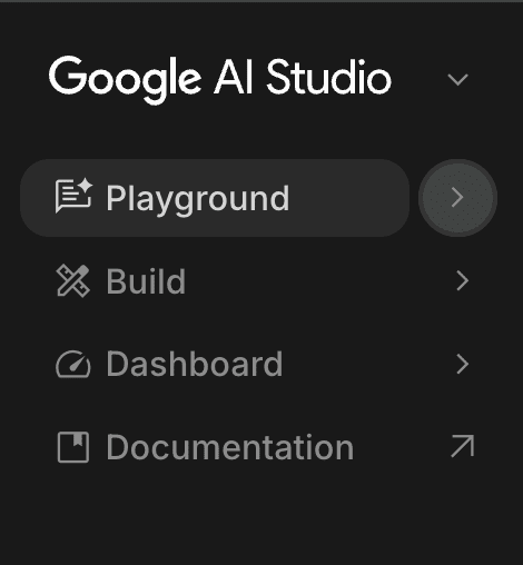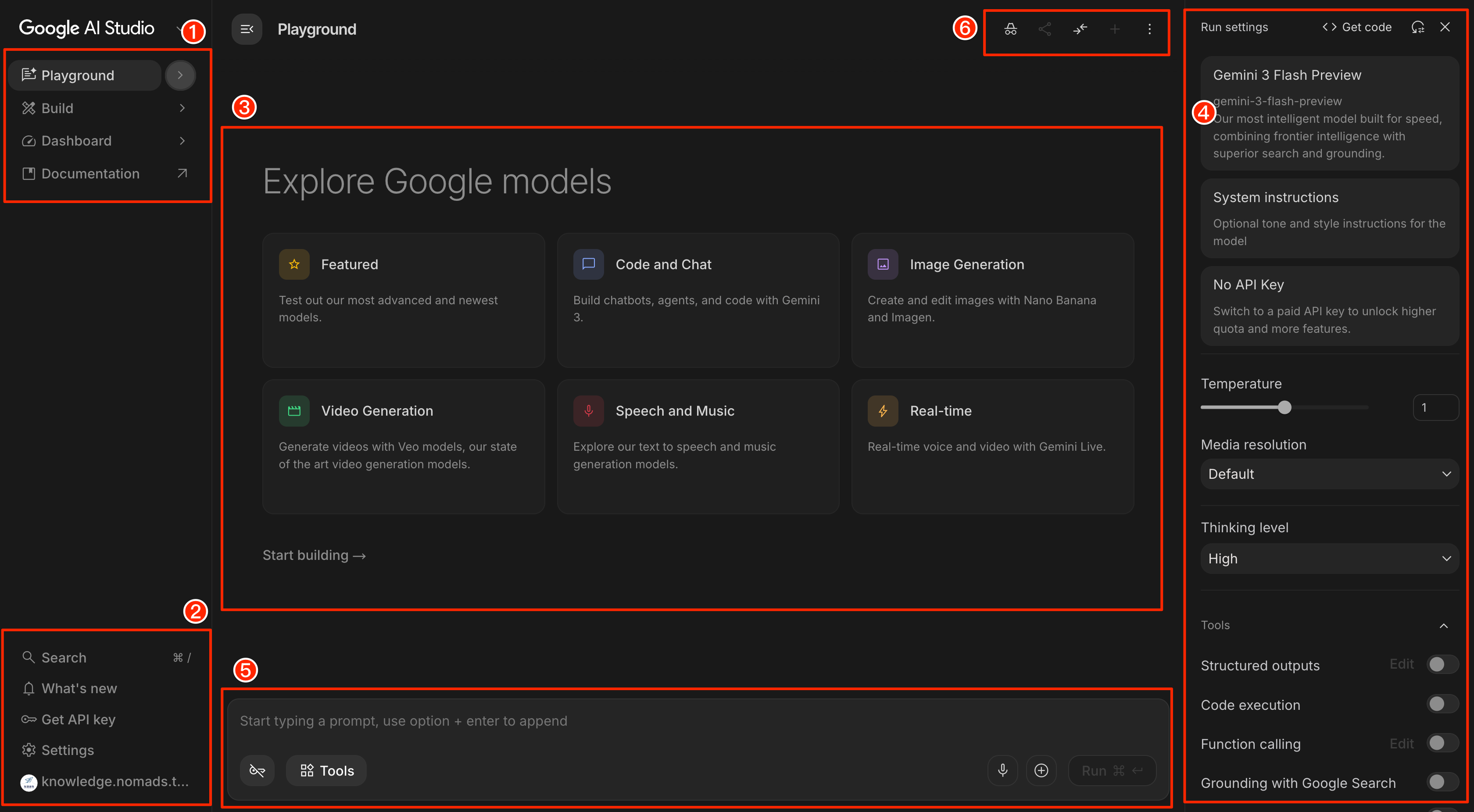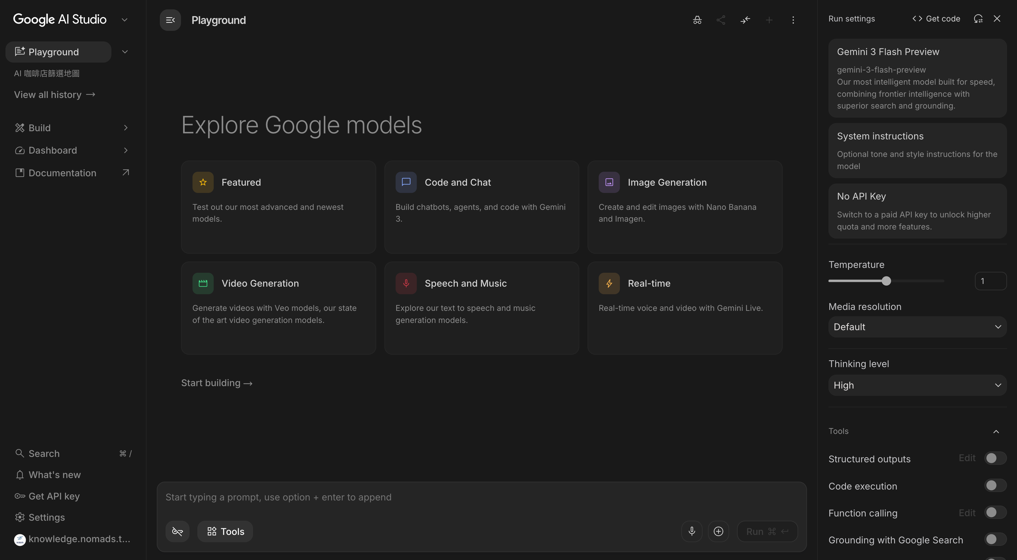 - Playground:作業區,要生成圖片、影片、語音與音樂等,都可以在這裡選擇 Google AI 模型。