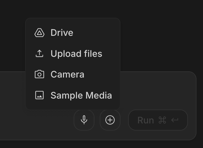 與模型互動的主要介面,點擊「+」可上傳圖片,並搭配文字指令生成內容;按下 Run 後,即可執行並查看生成結果。