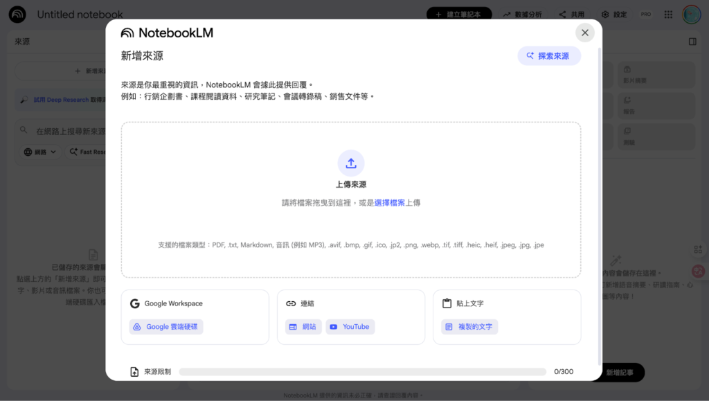 接著會跳出「 新增來源 」的視窗,NotebookLM 支援上傳 Google 雲端檔案、網址與 Youtube 影片連結,你也可以直接輸入文字,或者把 PDF、png 等檔案拖曳到畫面中央直接上傳。