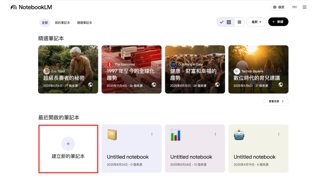 進入 NotebookLM 的個人頁面後,點擊「 建立新的筆記本 」創建筆記主題。