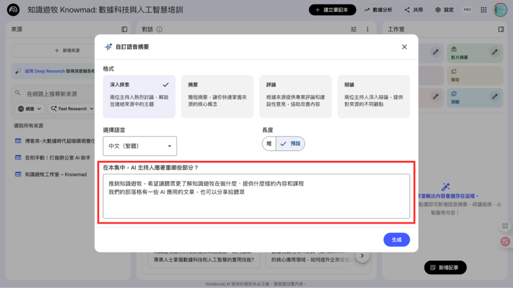 進入「 自訂語音摘要 」的畫面中,我們可以設定要輸出的內容,包括:輸出形式是雙人交談、辯論還是摘要,也可以選擇語言,當然也有繁體中文喔!其中針對「 AI 主持人應著重哪些部分 」這個設定,我們可以填寫針對這個 Podcast 的特定要求,例如「 我想要用這個 Podcast 推廣知識遊牧工作室的線上課程 」。