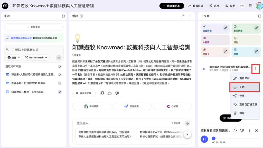 整個節目聽完,我覺得比較可惜的是主持人的口音較為明顯,像是咬字與語調偶爾顯得略微生硬,有時稍微感到不自然。如果對於生成的內容滿意的話,可以直接點選下載作保存;而如果還想微調細節或是補充資料,可以依照前面介紹的方式,再上傳新的資料或調整提示,讓生成的 Podcast 更貼近心目中理想的風格喔!