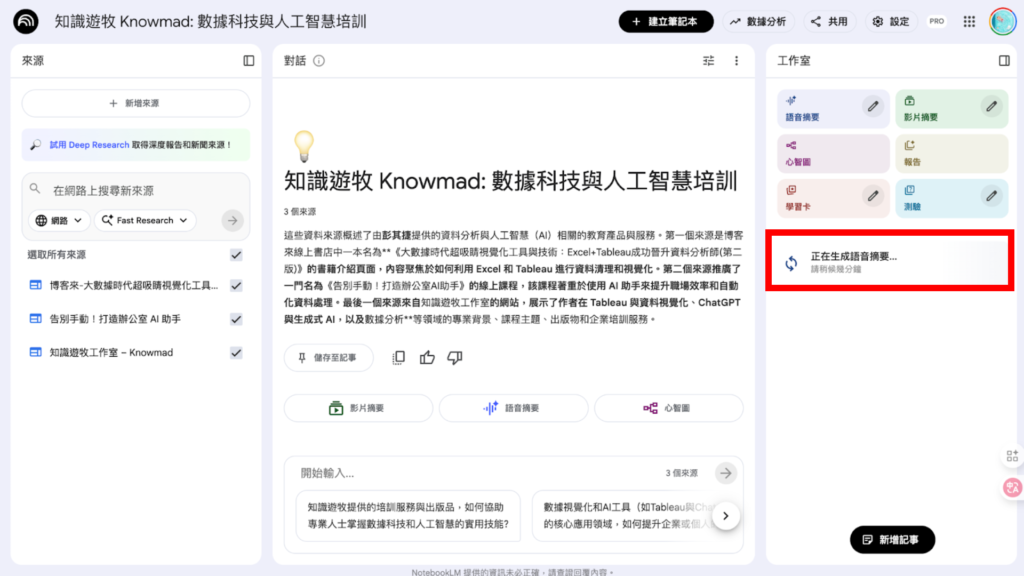 接著,NotebookLM 會讀取我們提供的網站內容,在畫面中央的「 對話 」自動生成內容摘要。如果想要再補充資料的話,可以按下左上角的「 新增來源 」繼續加入資訊。