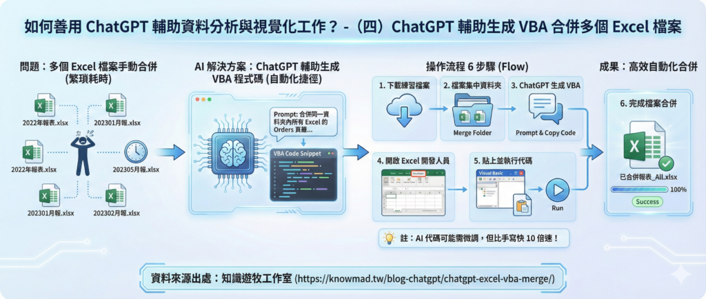 圖:AI 幫助生成多份 Excel 檔案合併的 VBA 語法畫面(讀者也可自由變化)