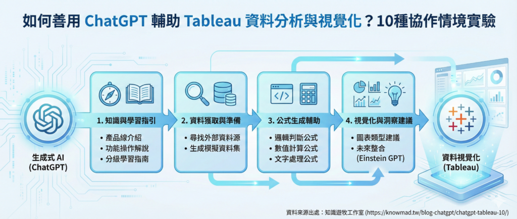 由於 Tableau 目前已經被 Salesforce 收購,而 Salesforce 陸續提出一些 GPT 的可能解決方案,根據 Salesforce 的新聞稿,生成式 AI 新功能「Einstein GPT」模組,可以輔助圖表生成,輔助摘要或是輔助文字生成等等。